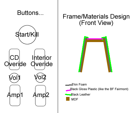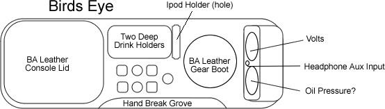 will make the frame from MDF (9mm?)Glue a Thin Foam to it and cover with leather then Embed the Black Gloss Plastic Inside It Havent Measured Anything Yet... Not to fussed About the Pods it it wont all fit... have a few things i want in it... Buttons -Engine Start/Kill Switch (hook up to starter motor wire)(push and hold while turn key to start) -Amp Auto/Off (1/2) (though remote on wires) -Headunit and Amps On (override Acc so can turn on CD without keys) -2nd Interior Lights Button (control all interior lights) Controls -Amp 1/2 (Bass) (through hard wired remote supplied with amps) Lights -from door switch rear - one each side below gear stick - one for back seats -from intermittent lights - leds below console lid shine forward on buttons - In Bottom Of Drink Holders Appearance - Leather Sides - Gloss Black Top (embedded In Leather) - Blue L.E.Ds Used - BA GT Gear Boot Other -drink holders x 2 on right -CD AUX Input (headphone Jack) -air to vents to pass thought drink holders into back (BA Vents?) Just to give you an idea... this is Dellboy999's