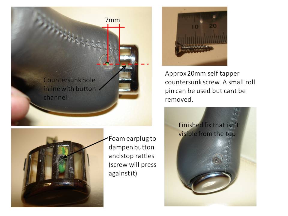 Thought i would post this up for anyone that has a broken shifter button on EF/EL auto especially the Ghia's as they cost a fortune to replace. All you need is a drill, small drill bit, countersinking bit, small countersunk self tapping screw and a foam earplug.