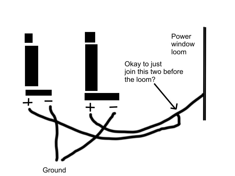 Okay, observe the crude drawing folks. Is this basically how I'm to do it? If I'm going to get into the power window source, where is this wire I have to splice into, and what does it look like? Do I have to splice at a certain point on the wire (before/after a fuse or plug, where?) and do I have to fit any sort of fuse someplace?