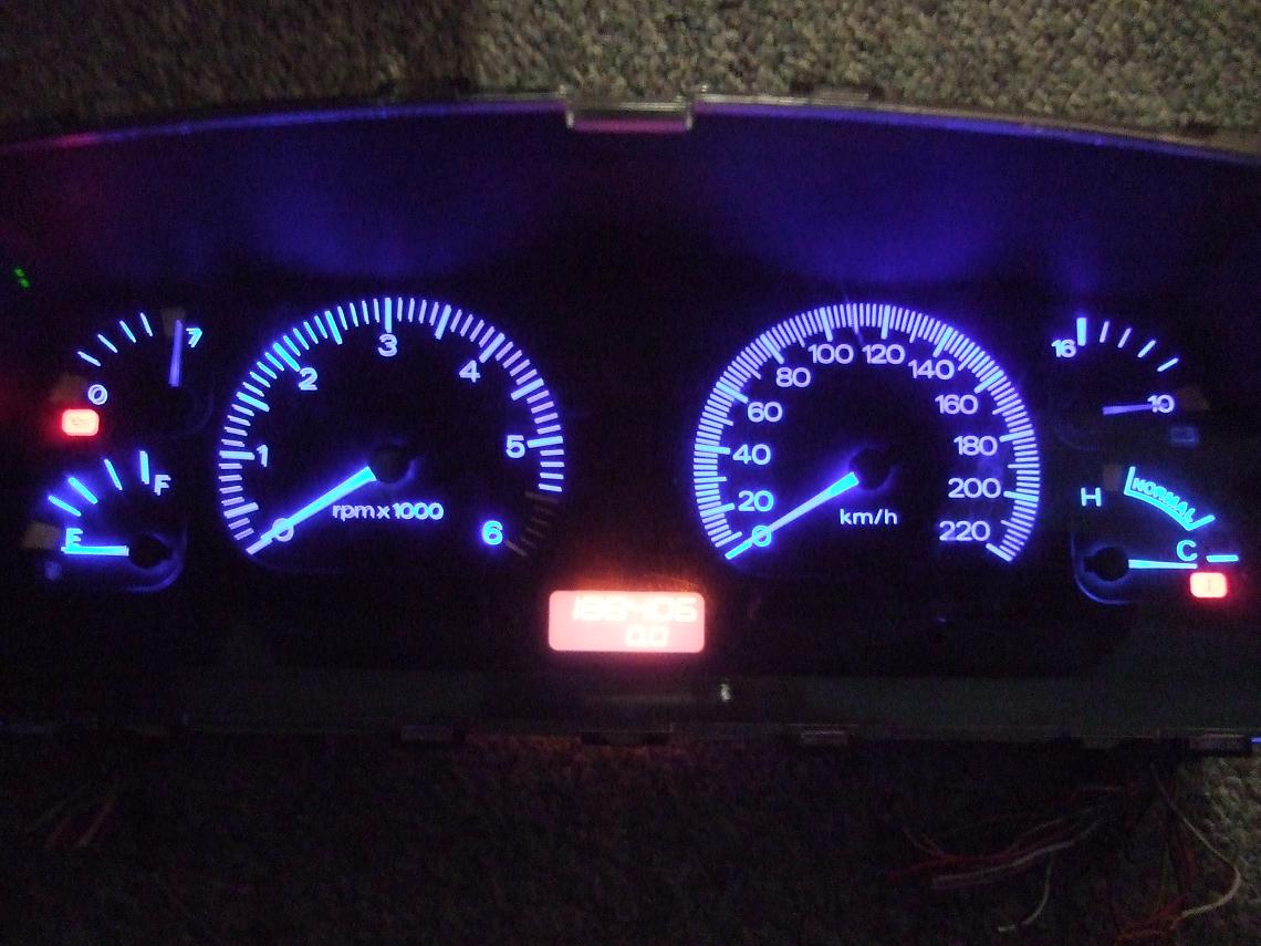 I modded the globe holders, soldered in resistors and bought some 3500mcd blue led's For more brightness I hardwired 4 more inside the cluster so the light traveled around the perspex. Now tho, these things are upto around 30,000 MCD. thats bloody bright, but they're around $4ea. I did mess around back then and installed red led's and it gave that nice looking purple fading into blue look as in the tech doc, but didn't look like that.