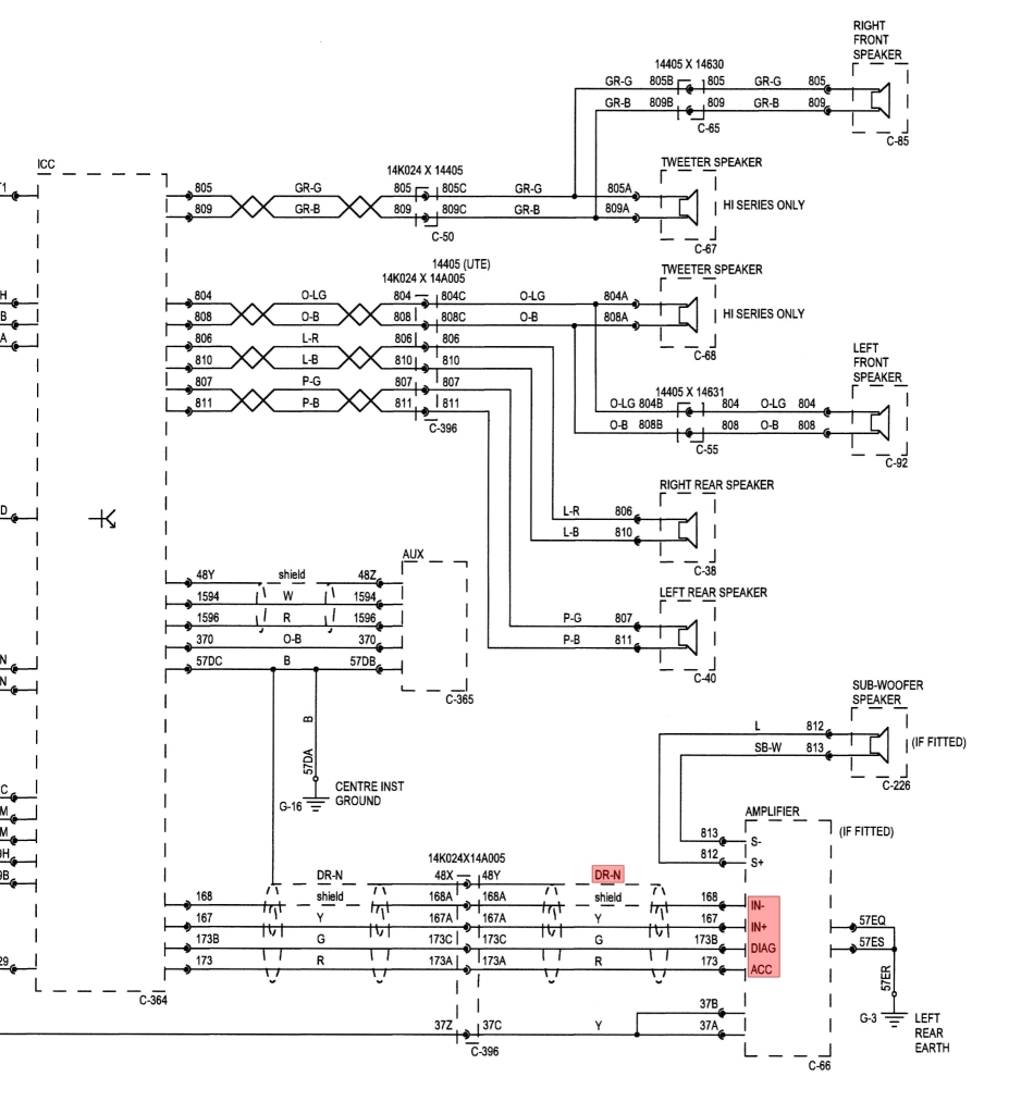{USERNAME} wrote: I still dont get the "DR-N" not really sure .. but i think it's referring to it being the 'shield' wire or type?. some of the higher class looms have shielded wiring to the ICC dash plug. as too Diag ?. i know on mine it throws a code up coz the amp is not there, may be a diagnostic wire maybe?. IN+/- refers to input polarity. and i presume ACC refers to accessory?. |