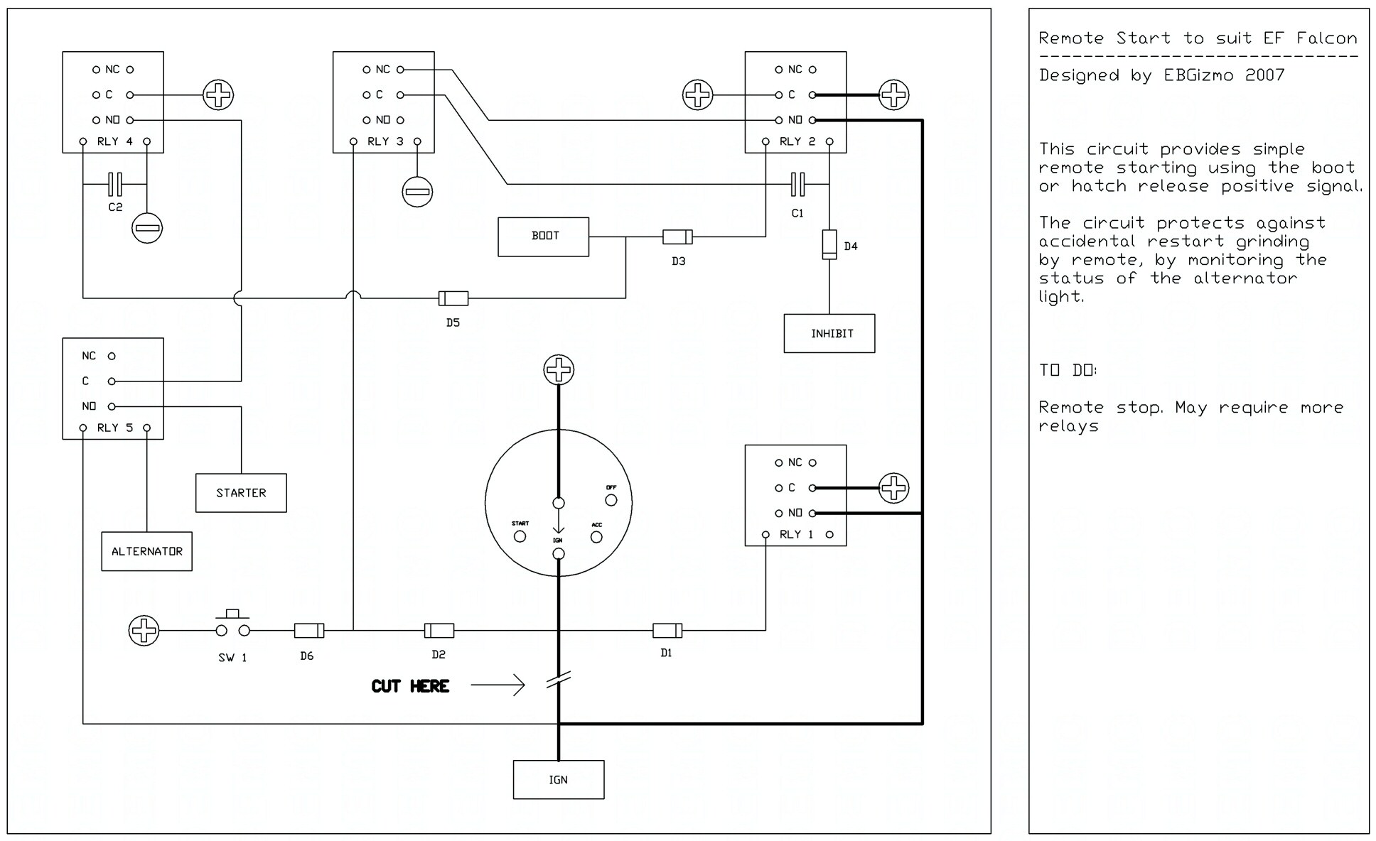 12/04/07 - If you are building this for EA-ED, there may be a problem with the anti grind feature. Relay 5 appears to be too high for these models (a 6V may be required). This is to be confirmed in the next few days 14/04/07 - Braidy has built and confirmed the modified circuit, which he has reported works on his ED. EA-ED owners should replace Relay 5 with a 6V version, such as the Jaycar SY-4058 (Pic below). Good work, Braidy! *********************************************************** I got a PM the other day on how to make a remote start that used the momentary boot release signal from the BEM. I thought I'd do up a tech docco in case anyone else was thinking about building one on the cheap. This design is similar to the one I built for my EB years ago, except it had a two channel dedicated remote to turn it on and off again. Not much else to say about it at the moment as it has not yet been tested on my car, but feel free to have a look and tell me if you can see any errors in the relay logic, or if you want to add any features. This document is considered Beta until it has been built and tested by the person that requested it Check the document, and check your own work! No responsibility taken etc etc. Basic Engine Start Circuit Parts, Connections, Purpose RLY 1 : Ignition Key Replacement (30A minimum) RLY 2 : Remote IGN Latch Activate (30A minimum) RLY 3 : Remote IGN Latch Break RLY 4 : Optional Crank Timer (If Boot signal too short) RLY 5 : Anti restart feature to prevent grinding by remote. INHIBIT : Starter Motor Relay Negative STARTER : Starter Motor Relay Positive ALTERNATOR : Negative from cluster Alternator Fail light. BOOT : BEM Boot release signal Positive C1 : IGN transfer overlap Capacitor (200-500uF 16V) C2 : Optional Crank timer extended pulse time Capacitor (10-1000 uf) D1-D7 : 1N4001 Diodes SW1 : Manual Cut off switches. (Dash, Brake pedal etc) To Do: Work out way to turn off ignition with same button Timer circuit Circuit Behaviour RLY 1 takes the place of the ignition switch, in that it now supplies power to the IGN wire when the key is turned to the IGN position. If positive is supplied to the BOOT wire, RLY 2 will energize, and latch on through the C/NC contacts of RLY 3. The BOOT wire also supplies power to RLY 4 to provide a longer crank time should the default BEM pulse not be sufficient to start the engine. The value of C2 is dependant on how much time is required to crank the car before it starts. Engine cranking will not occur until the Alternator light is lit, which will close RLY 5 and allow the pulse from RLY 4 to be sent to the starter relay. Once the engine is running, RLY 5 turns off and prevents any further button presses from cranking the engine, which prevents restart grinding. Pressing SW1 will activate RLY 3 and break the latch on RLY 2, removing power from the IGN wire and stopping the engine. If the engine was activated by remote, and the key is turned to IGN, this will also break the latch, but the engine will remain on as RLY 1 now takes over in powering the IGN wire. C1 provides a small overlap while the change over occurs, keeping RLY 2 active for a short time while RLY 1 turns on. Diodes D1 to D7 prevent back feed between the control signals. The original IGN wire must be cut at the point indicated so that the circuit can sense when the key is turned, regardless of whether the ignition is on or off. The BOOT wire must be cut at a point after it exits the BEM, before it reaches the boot release switch, or pressing of the dash Boot button will result in the engine starting. Connections The INHIBIT wire coming from D4 on RLY 2 needs to be connected to the negative of the starter motor relay coil – as this releases the latch if the gear selector is moved out of park or neutral. The STARTER wire coming from RLY 5 needs to be connected to the positive of the starter motor relay coil, to provide cranking. The wires marked with a heavier line must be the same or slightly greater than that of the original ignition wire. RLY 1 and RLY 2 must be rated at 30A or more, as they are now responsible for carrying the ignition current that the switch used to. The schematic (Ellery’s) is unclear as to what rating each fuse is, so if you can get your hands on a 60A relay for these two, this would be even better. Only RLY 2 needs to be DPDT, the rest can be SPDT to save money if these can be obtained cheaper. Pay particular attention to the direction the diodes face - the circuit will not work properly if they are inserted incorrectly. Edit: This unit will not function without a smartlock bypass module or similar modification.