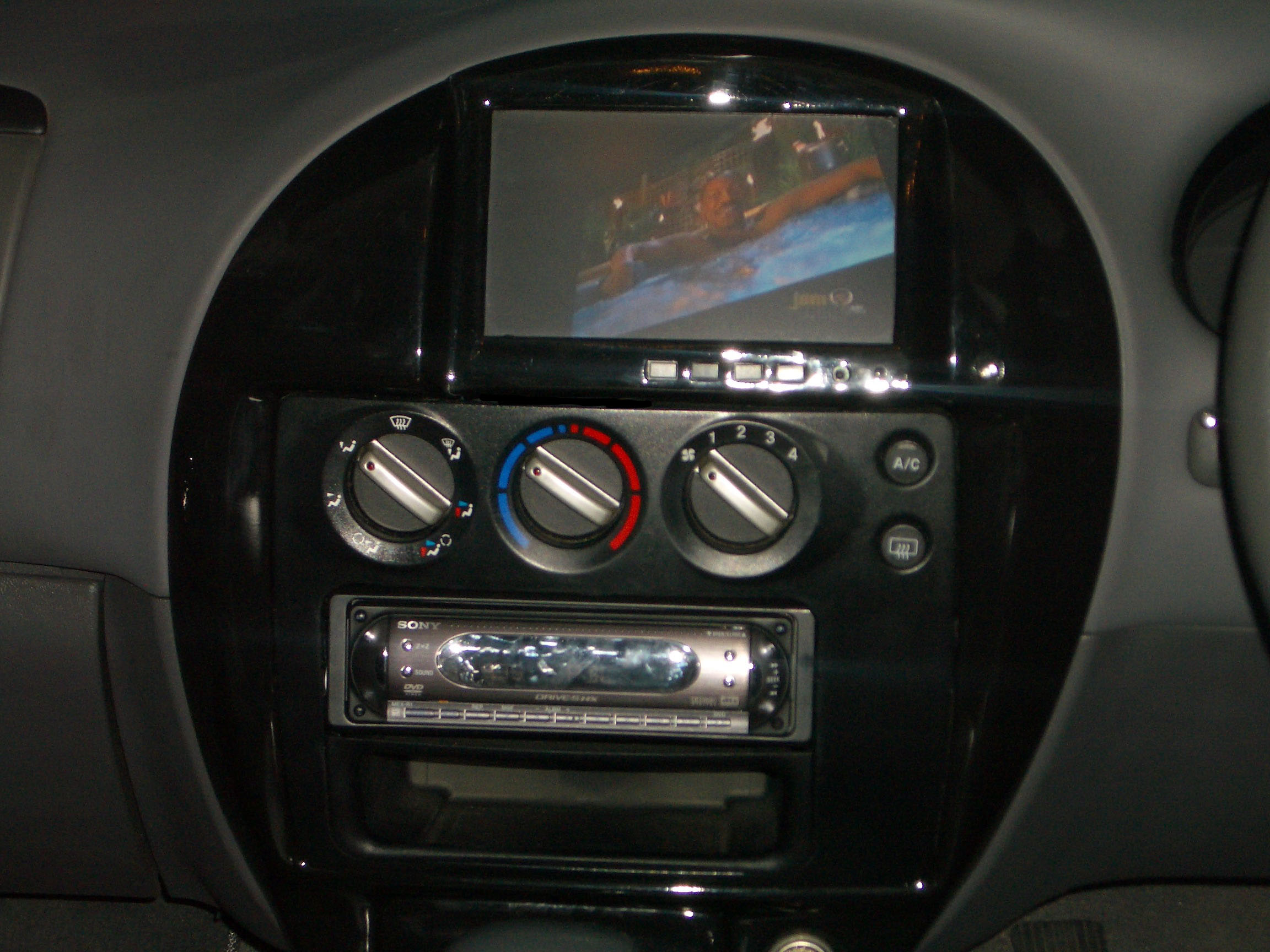 I did this for a mate of mine who drives a BA falcon, and now we're offering it to my other fellow Ford fans. Its a 9.2" LCD screen, installed just above the standard sound system, which is hooked up to an after market headunit, installed next to the cigarette lighter. The photo posted up is just one way of doing this install, there are plenty others availble. Its even possible to keep the airvents. REMOVED BY Neo_Nick Dont forget that Putting things where they dont belong is our specialty, so if you have any other crazy ideas, Im happy to listen!