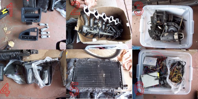 1: interior parts, stereo surround, and aircon vents/surround, manual winders 2:EA MPFI manifold, TB, fuel rail, injectors, and loom missing TPS and the plastic bit at the back. 3: EA, PS pump, aircon compressor, alternator, starter motor and a pair of front bumper mounts 4:EA elec mirros, switch, passenger panel thing, and som of the wiring. 5:EA-E? radiator and aircon radiator, aircon one is damaged but works, radiator is in good condition and is a natrad reco. 6: box containing EA dash wiring loom (some plugs missing) cruise module (91DA part number) and BEM. X: not pictured is an EF/EL rear bar, unpainted with REO but no mounts X: i also have the tube thing that goes in the EF airbox to smooth airflow. all parts are free, id prefer you come and pick whatever you want up but i can send stuff (you pay of course)