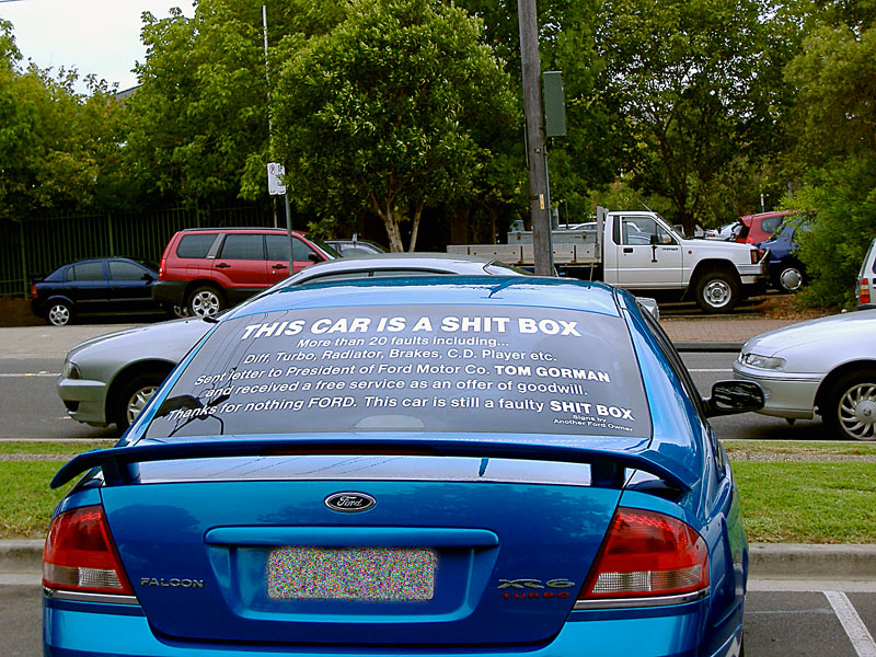 {USERNAME} wrote: {USERNAME} wrote: XR6T's are great, that guys a wanker, and if he'd rather waste his time making up a big sticker and driving around having a cry about his car and not trying to sought out his situation hes a toss bag. Strongly disagree (sorry I've been witness to the absolute WORST service I have ever seen from a company full stop! That company was the local Ford dealer! Trust me, we are at the stage of doing something like this, as there is now other way of getting the problem fixed (short of taking costly legal action!). I'm assuming this guy is in the same boat. If Ford want to sell more cars, they've fixed the product, now they just need to take long hard, bloody good look at some of the s**t dealerships out there!!!