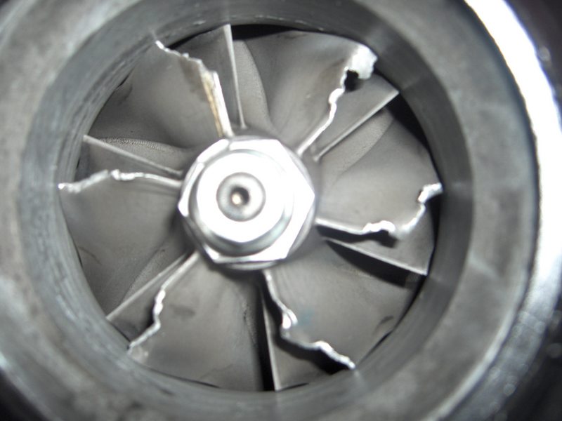 seems a comon occurance normally induced by mechanical damage (dirt) then as you boost under the high speed's it gradually gets worse and flies to peices seding alloy into the cooler and then the engine! time to replace the cooler or at least wash it out and chek that the turbine wheel is fine and that the shaft is not bent!!!! |