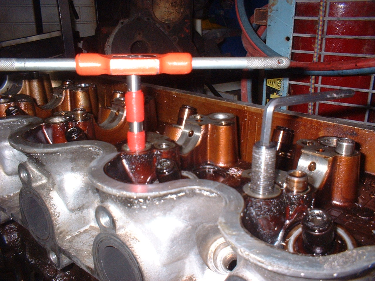 The process goes as follows Fill all head bolt holes in block with oil Place head on block, located with locating rings/dowel With the 180mm long tap supplied, grease up with grease to catch cut metal. Place tap in head bolt hole till touches old thread in block With tap T Bar start turning tap slowly 1/2 turn at a time and then backing off and at the same time pushing down firmly untill tap has reach bottom of thread Voila easy as. Should take around an hour Here are a couple of pics If anyone further is interested in a set then PM as this bolt order goes in this coming Tuesday 13/2/07