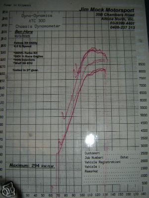 i mean, look at the angle they have the dump pipe coming out the turbine, what the?? no way is that good for flow my 2c Hmm, just your 2c worth. Budy, obviously you chose a cam which has far too much overlap resulting in much of the boost being blown straight through the eingine and out the exhaust resulting in a loss of power potential and over boosting. As i said in your (too much freakin boost) thread, you've made the incorrect choice when it came to selecting the cam for your 'superman flow' (better than anyone else has ever done) engine combination. If you had the correct cam you'd be making around 360rwkw @14psi instead of the figure you've extracted. I have a dyno graph which is the initial tune done on the same engine type as yours, using a snortperformance stage 3 system, KKK 600R T3 turbo with a .84 rear housing and '50mm gate'. The engine and tune was done by JMM. As you can see it's only running 9psi on this graph but still made 294rwkw out of the box shortly before the drivetrain became an issue. The boost has since been wound up to 14psi where it's now churning out 360 at the treads. And, you know what, it was all done without destroying the turbo unlike you have on your system. But hey, if your customers don't mind you taking to their new $2,000 turbo with a gas axe, 'just so you can control boost pressure', so be it. Think about this though, how does a BA control boost and make 400rwkw with the original 35/40 roller bearing turbo, using its standard tiny internal gate with all of Nizpro's best bolt on goodies? Are you saying that your single cam I6 out flows the BA 4 vavle VCT engine with $10K worth of Nizpro bolted to it? Budy i don't think so. I'm expecting your answer to be something to do with your manifold design being superior to everyone elses, even though it's a direct copy of a snortperformance/JMM manifold just with extra butchering. When i first saw your manifold/turbo setup i thought it looked pretty good but that was before you rooted it. Look forward to reading your next colourful coments and severe ways of fitting wastgates onto turbine housings, in the future budy, don't go slagging off other people's work as it can often backfire on you.