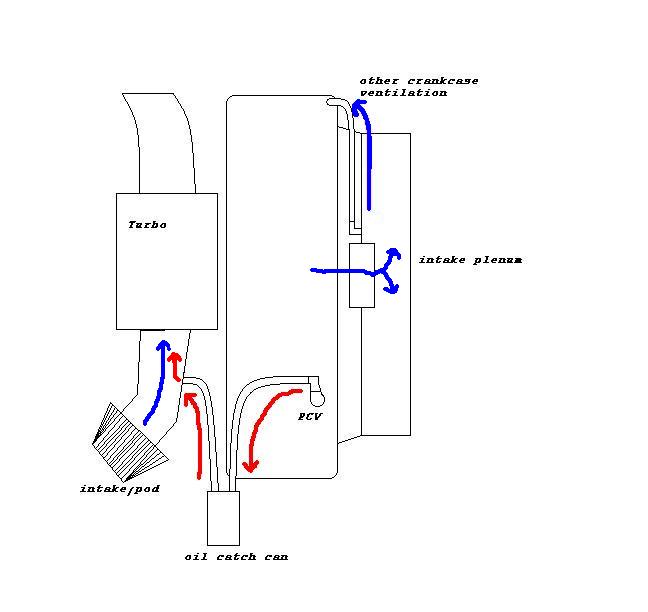 fritzz's diagram is the correct way. Off boost the PCV will work to provide suction from the crank case to the inlet manifold. When on boost the PCV will close and the rear vent will then provide the suction from the crank case through the catch can to the front of the turbo.