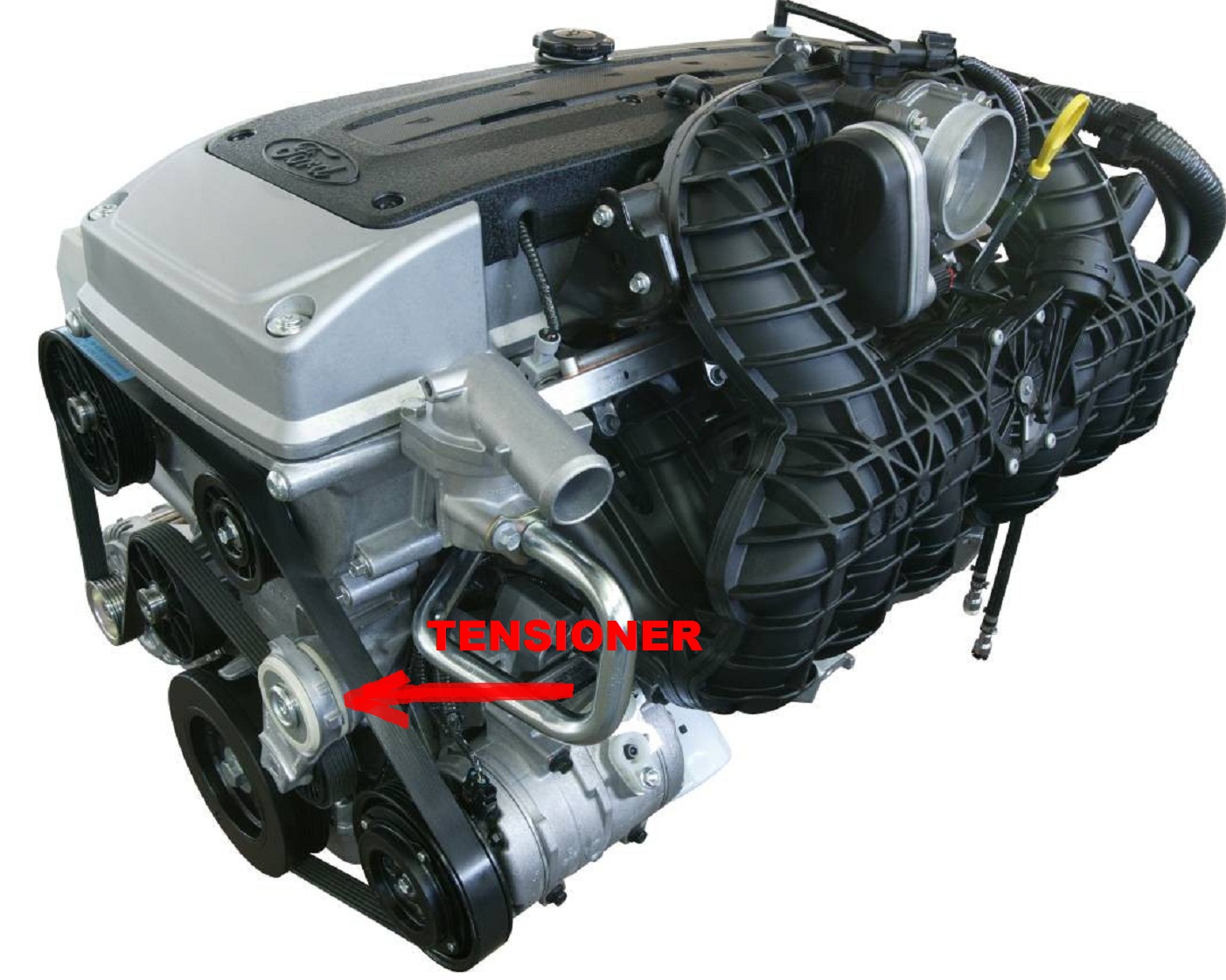 If think I have worked out where I went wrong with the tensioner. If you look at the pic below of the front of my engine you will see that I have positioned my tensioner after the supercharger and before the AC Pump.