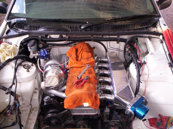 acl race pistons, ring brgs, 8.4:1 balanced rods, crank, pistons decked block, 20' over toque plate honed modified crankshaft oil galleries modified factory oil pump ported head, modified chambers, 50' o/s valves, 132lb seat pressure springs, std retainers and collets, stg3 crow cam which is carried over from N/A use.... test it to see how it goes. vernier cam gear, new chain n guides custom manifolds, ceramic coated ex manifold and turbine housing 600cc injectors from 6boost modified std dizzy (10mm top gun leads) SARD fuel reg 044 bosch pump, std size 5/16 fuel lines modified std fuel rail with twin entry (either end with retun in centre) gt3540 1.06 and .7 turbosmart 48mm wastegate turbosmart vee-port BOV 3in cooler piping, with 4in filter tube and 4in pipe on throttle body 90mm throttle EBAY 600x300x100mm cooler (bar n plate) thermal flex silicon cooler hose (stainless t-bolt clamps) modified accelerator pedal and cable ceramic button extreme clutch speedflow oil and coolant lines to turbo (-6 coolant -3oil) custom radiator header tank using a regular recvery type system with overflow bottle modified thermostat housing with a hilux top hose to allow clearance for the throttle body custom oil catch can battery in boot autronic SM4 with autotune (xf idle valve) crane HI-6 with LX-92 coil wideband A/F meter speco 20psi boost gauge and anything else ive forgotten...