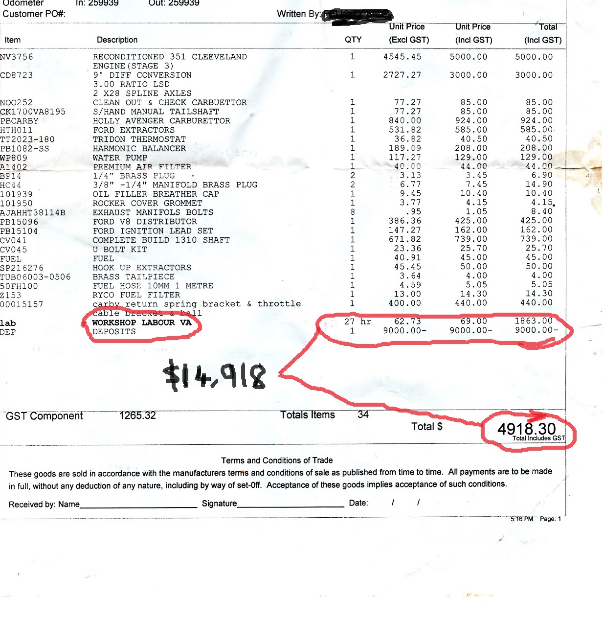 Doesn't look unreasonable. Thought you were saying it was a $15k engine. If you use a calculator it's just under $14k for recon engine, 9" diff, new driveshaft, a bunch of engine related components and a heap of labour. A couple of the items are OTT price-wise, but generally OK. That's just what things cost.