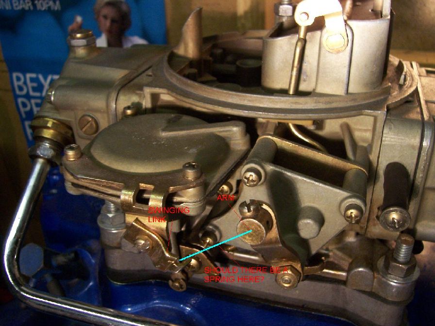 Just a little question though. On the vacuum side of the carb there is an arm to open the secondarys, it looks as though there is supposed to be a spring going from the arm and attaching to a small swinging link fixed to the vacuum diaphram housing. Does this sound right, because there is no spring there now and the secondarys dont want to close unless you lock them open then give them a tap, when which, they snap shut. See pic. Also are there supposed to be plugs in the fuel ports on the side of the carb not being used, or are these sealed by the large screws in the centre of the carb at each end?