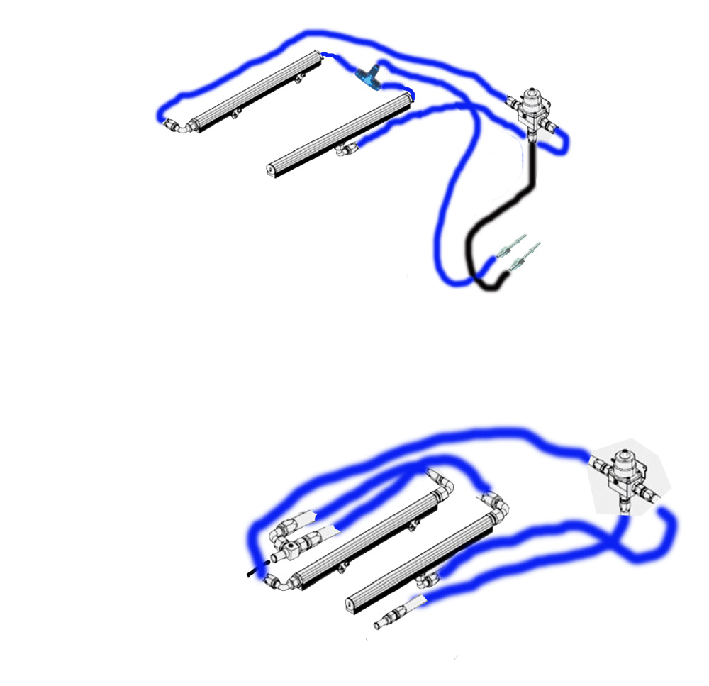 Supply goes to one side of the rail. From there it goes down the rail, to the rear and crosses over to the 2nd rail. Your 2nd rail terminates at the other end. The return, which is half way along the rail, then goes to an input in your reg, and the output of the reg returns to the tank. Sorry i have no pics but thats the idea. Brett