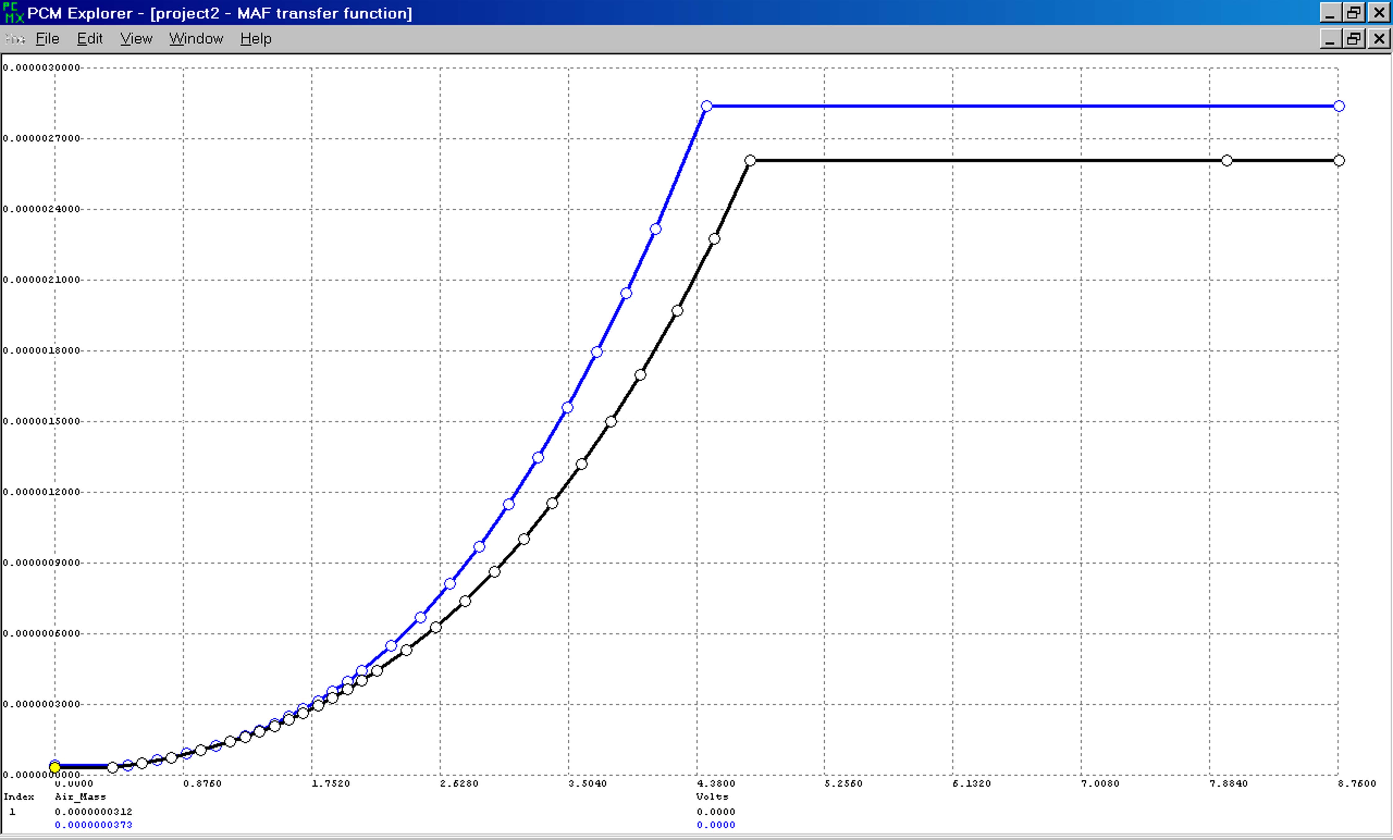 Although not a strictly accurate comparison, it is still close enough to make a judgement. Here are the numbers from the binaries showing EL MAF transfer v's AU MAF transfer. Note that the AU MAF transfer curve was not a typical shape and so some (very) slight data smoothing was performed. The data shows MAF voltage output v's Air flow mass