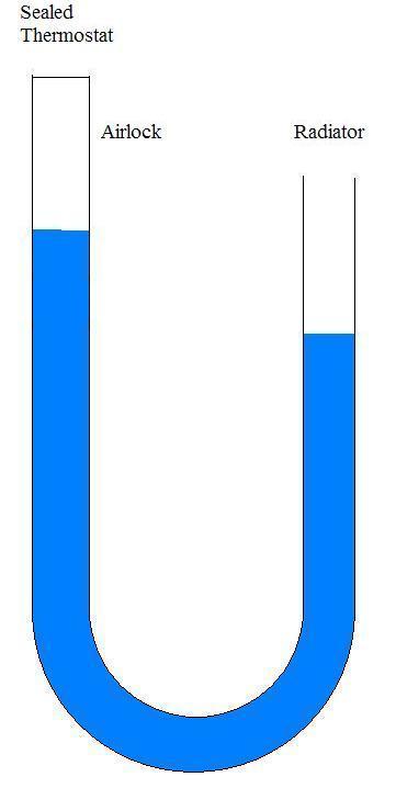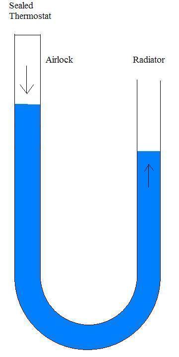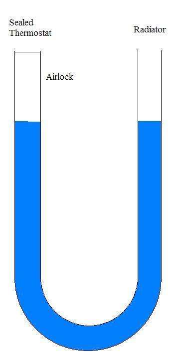 picture a clear hose like this filled with water, open both ends... Attachment: Now where your thermostat end is picture it sealed (the screw) Attachment: and this is your general arrangement Attachment: Your thermostat housing sits higher... and due to the seal your water changes level relative to the other end of the hose... Attachment: as such your water weighting is like like this, but due to the seal on one end it will not flow to level out Hence your air lock in the top of thermostat housing... Attachment: now see part two coming shortly...
