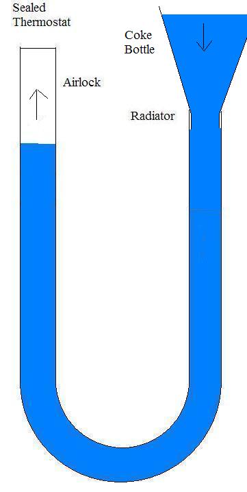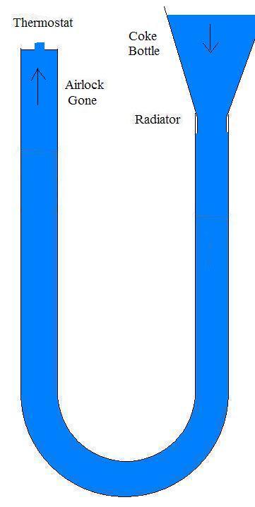 Attachment: This is bad... Going back to image 5 (last in the above post) and imagine your coke bottle... full of water... now your water weighting has changed... Attachment: Now assuming you keep adding water when you open the thermostat screw the water will rise and escape out the top eliminating the air lock... It doesn't transfer to the highest point... Attachment: So yeah... I hope this makes more sense...