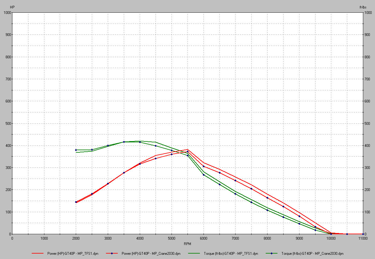 I used to have a list some years ago which I put together showing me all the traditional cams as well as the Ford alphabet cams ~ and which RR ratios were applicable. I even included a whole bunch of U.S. cams just for a laugh and ran the whole lot of them through desktop dyno to compare the output differences and see where the power and torque levels differed. Now granted that desktop dyno is a software program, I used it more for just general research because in real life there are way too many factors and individual differences in everyone's motor for this to be a guarentee so treat it accordingly. I still have a graph I saved some time ago when comparing a TFS1 to a Crane 2030 and have attached it. It's just to show that there is not much difference amongst some of the more well known OTS cams.