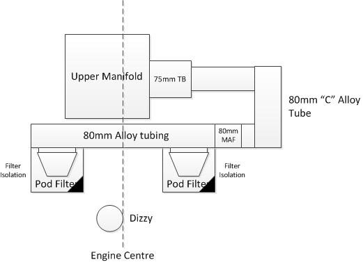 Huge fan of the XB/XC bonnet flutes in BENJ and SWC's and I've finally got around to a.) finding a suitable XB donor.. and B. competent panel beater/spraypainter etc.. (have asked him to provide photos) So I thought.. could I re route the vents to function like an intake?. I initially considered running down to the existing airbox but then considered possible intake lag (plus replaceing a heap of tubing that I would have to do anyway. So then I thought about a couple of flat pod filters like these -> http://www.summitracing.com/parts/SUM-F1158/ Into some 80mm alloy piping.. retrofit the 80mm maf then into a "c" bend then back to the throttle body. see the attached ... dodgy diagram. Thoughts anyone?