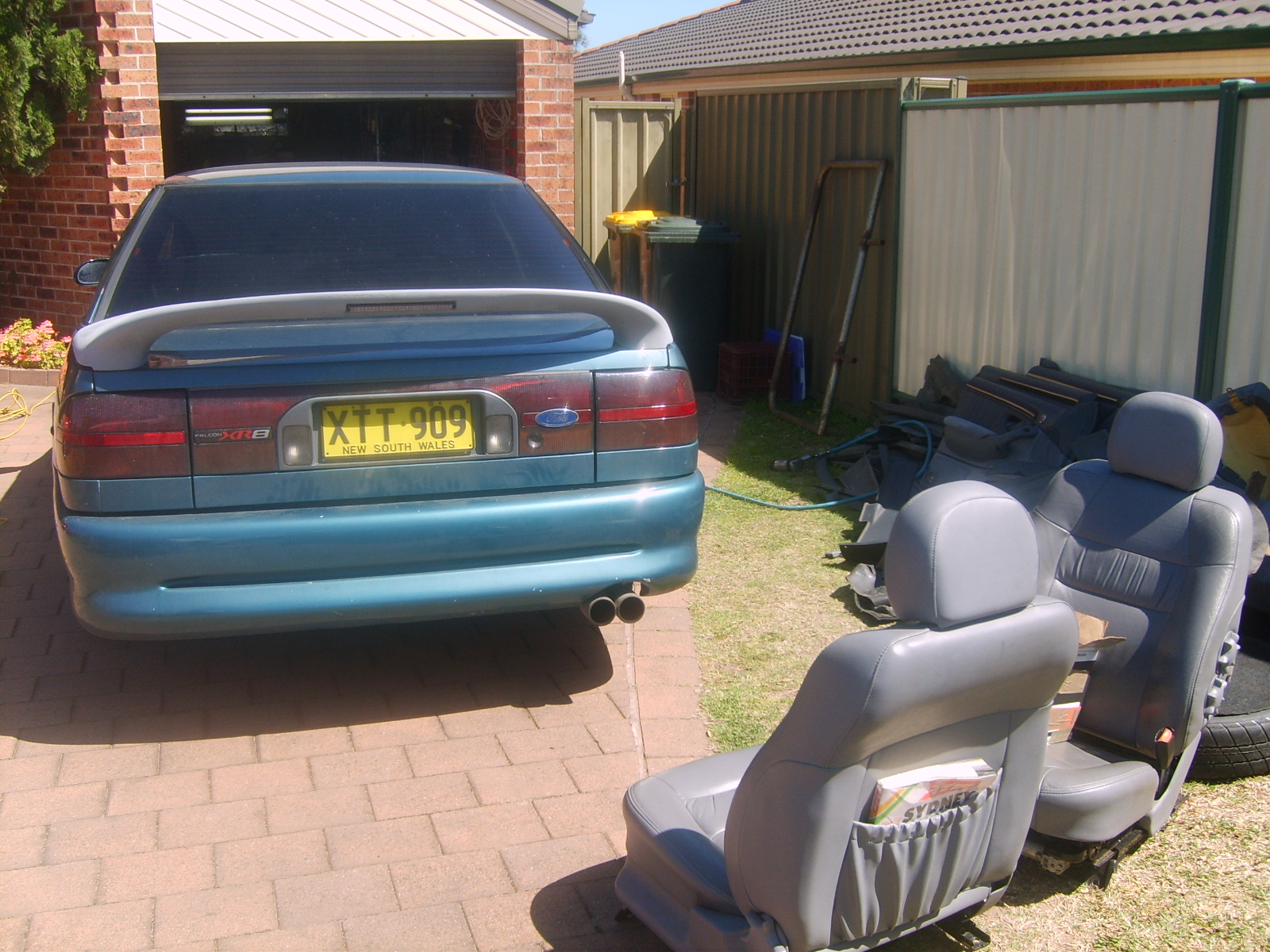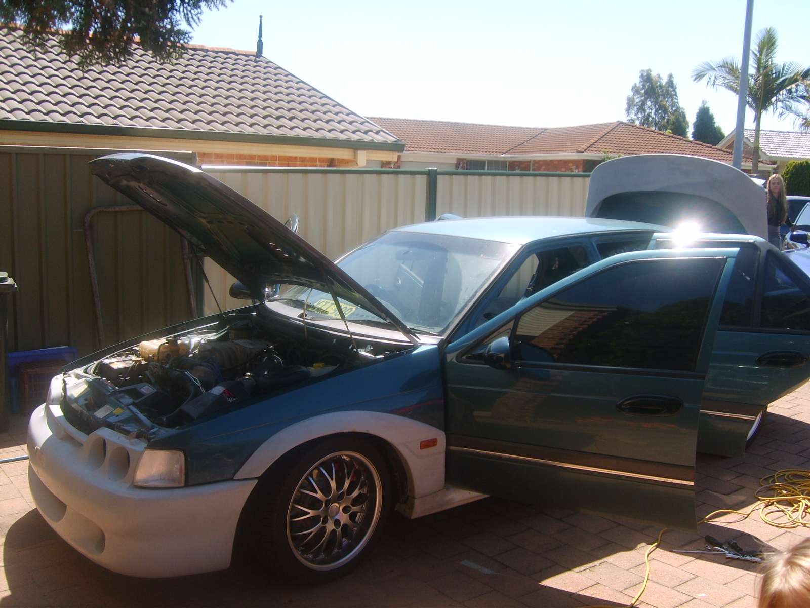 currently in panel shop .. getting 12k worth of paint down.. custom colour brandy wine and candy apple red over silver. had the irs conversion and brake package engineered 330mm rotors and custom full floating hubs made up to au offset with pbr twin piston cailpers and braided lines if any one interrested in a set can do them with exchange spindles for $1900 to suit ea to el but with au offset only (which means au rims and tyres) and min 17" rims and yes can have them to ya door in 5 days after payment with everything to bolt them straight in including new bearing and seals !!!!!!!! the engine is about to go to westend to get 347 stroker kit machined up gunna run alloy heads and trick flow mainfold and 75mm throttlebody and custom billet egr spacer with comp cams stroker cam from states and heaps more goodies from the states 90mm maf and stuff like that hopefully done by christmas !!! see the strip pics did ya still want me to do a write up on the irs conversion??