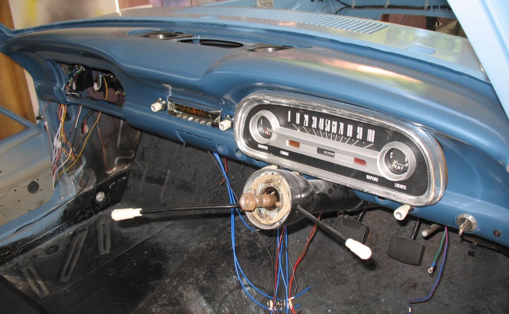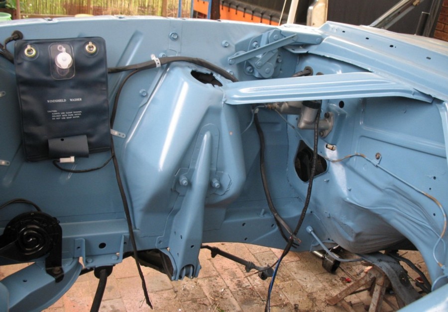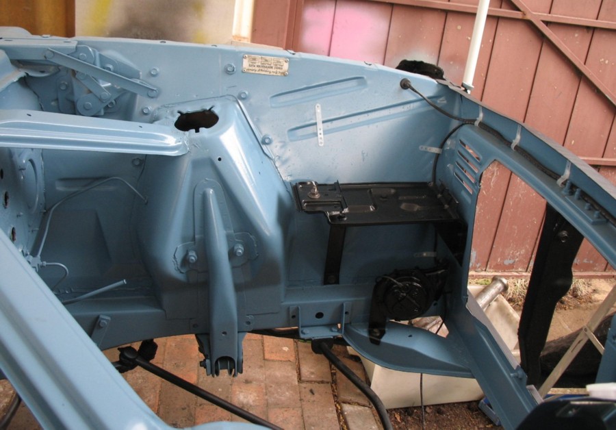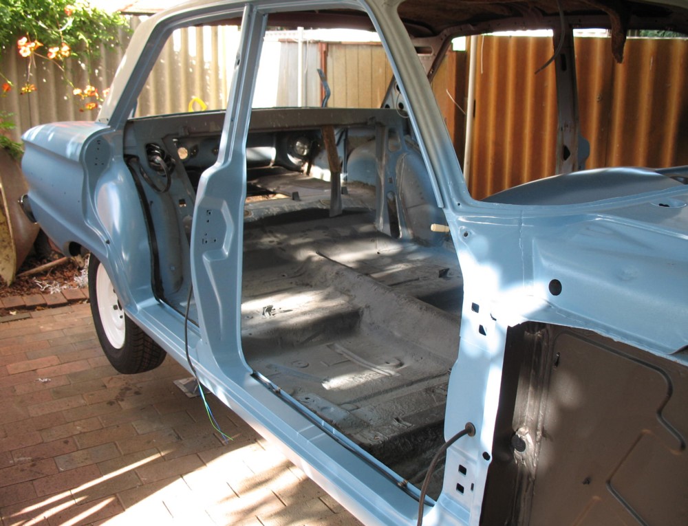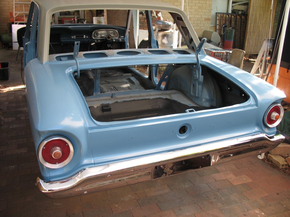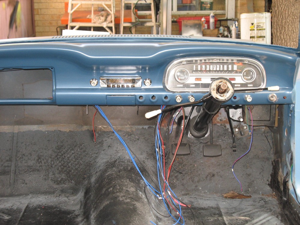 The 1963 XL Falcon is progressing well and I have been a bit slack in following up in the forum. Since last update. Wiring has progressed well but as you can see from the photos there is still a bit to do. I have installed an immobilizer and central remote locking. Have finished the body work and have painted the final correct Blue. The rear is ready for a buff and polish. The tail lights have been installed and the rear bumper re-chromed and fitted. The roof will be painted later in the original two tone white. Removed the complete rear axle assembly. Dismantled and cleaned all components. New wheel bearings and seals as well as new pinion oil seal. The internals appeared to be OK. Took all external components of the diff and brake back plates back to bear metal and etch primed and finished in two pack black epoxy enamel. Rebuilt the brakes but reused the old rear hand brake cable after cleaning and lubing. All new suspension rubbers and a pair of Munroe shock absorbers. Put an extra leaf in the springs and lowered 50mm. Wheels were sandblasted and powdercoated white. New tyres all round 185x80x13. Rebuilt the steering box with new internals. Replaced the inner lower control arm bushes and anti-sway bar rubbers. Reinstalled the steering column. Rewired the dash unit, cleaned, polished and reinstalled. Cleaned and checked the radio, got it working sweetly, polished the chrome and reinstalled. STILL NEED THE 6 BUTTONS FOR THE 3 STAR RADIO IF ANYONE SHOULD HAVE THEM. Cleaned the underside of the body and coated with noise deadening underbody spray followed by two coats of brushed on two pack matt black epoxy enamel. Have sorted out the driving of the airconditioning compressor. Thanks to the suggestions. Still need to finish off the brackets. Will need to relocate the right hand horn to give room for the compressor. (Alternator and compressor components are only dummy for set up...) Got hold of a nice cast rocker cover. It was already sand blasted so might just give it a coat of clear finish and leave it as is..... Gear box is now ready to mount to engine. NEXT. Picked up a couple of XP heater units on ebay and will build up heater-demister. Got an XM-MP two speed windscreen wiper and switch. Now need to overhaul and fit. Picked up another air conditioner evap unit. This is the correct Smiths 1963 aftermarket unit that was fitted to cars of that year. Then to doors - LHF is finish and painted external. RHF rust cut out. Back door not started.... Will give another update when we are a bit further along......