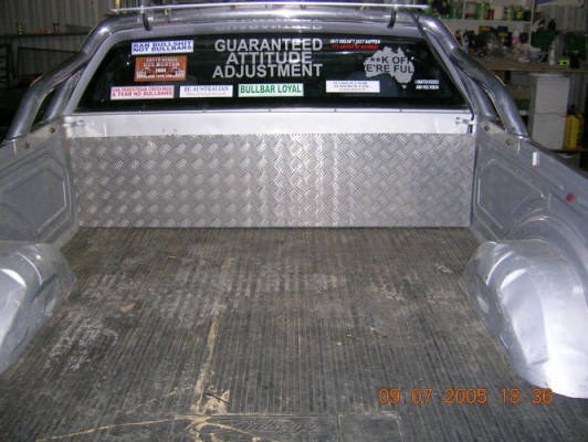 All right. Heres some pics. Still needs finishing around outside. Also gunna box over the wheelarches and down the sides the same with small doors for putting jack etc in. Also have to put doors in checkerplate in pic cos I wanna put second battery in there as well as my jack etc. In the back behind the wheelarches I intend putting two insulated boxes opening at the top (dunno what I might put in there?