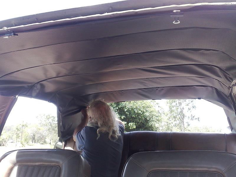 Sooty, The power steer pump was left in place with a loop hose to keep the fluid in. May want to use it later. I would like to see some photos of your 5l W Thanks Mus & Mick, revhead & all others. Hoodlining going in, A bit in that, Had to get a mate to help me with it,