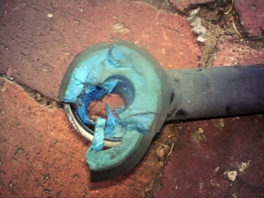 Jacked it up tonight and found this... (refer to attached photo) Three of the bushes were like this... I assume this was the cause of the noise... They were reconditioned EL upper trailing arms with Noltec bushes. I put them in just over a year ago... they should last longer than that! Any suggestions on why this has happened so quickly? I'm going to replace them with Pedders rubber bushes.