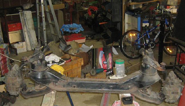 Here's some shots for one and all. I'm going to use an L300 frontend under my XK, so I can remove the spring towers and fit in a clevo. I picked up a van near my place, I think it's a 85 model. I knocked on the door and paid $150 for it. I should get most of that back because it has a new radiator and the motor goes etc. You can see my XK in the background. I already have another L300 frontend in the shed (shed's a mess, I know!) for a hotrod I'm fiddling with, so I included a shot of it to show how one looks. This one has had all the mounts trimmed off, so it really only gives you an idea on their configuration. All the steering arms and the springs are off it too. You can see the clevo in the background if you look close. I'll see if I can post a shot of the freshly harvested one with all it's peripherals attached once it's out. I know I digressed a bit, but it's all the same project.