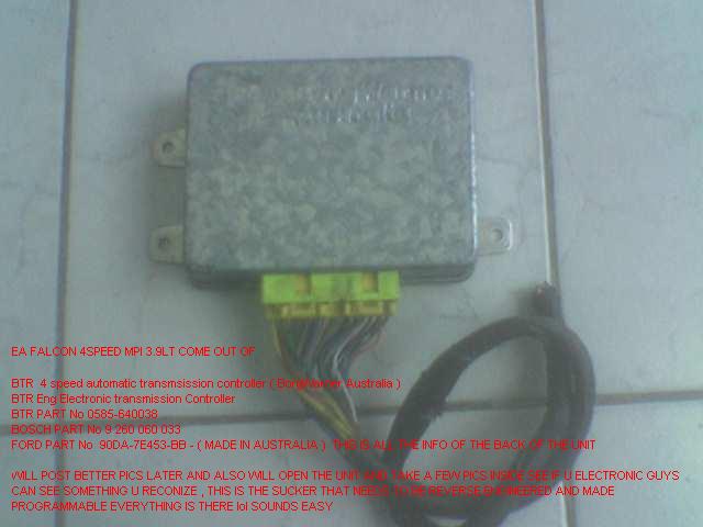 this is what should be dismantled and reverse engineered and made programmable all the electronics is in it so how does the BTR or ford technicians program this microprocessor who's keen on deciphering the codes to the heart of ford 4 speed autos some how wire up a PC(laptop) cable and make it programmable mmmmmmmmmmm sounds easy BTR 4 speed automatic transmission controller ( Borg/Warner Australia ) BTR Eng Electronic transmission Controller BTR PART No 0585-640038 BOSCH PART No 9 260 060 033 FORD PART No 90DA-7E453-BB ( MADE IN AUSTRALIA ) THIS IS ALL THE INFO OF THE BACK OF THE UNIT WILL HAVE ALL THE PIN OUT INFO TONIGHT CHEERS