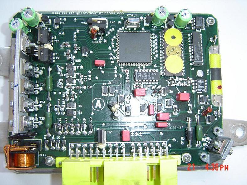 The transistors on the left hand side would be FETs for the solenoids probably. Im trying to think of what that solenoid in the bottom left corner does. You could start by pulling those yellow stickers of that chip, getting the Part number and the manufacturer. Then just check (google) if it is memory, and try and get a datasheet for it, and then we can try and read what is on it? Anyone else? Cheers