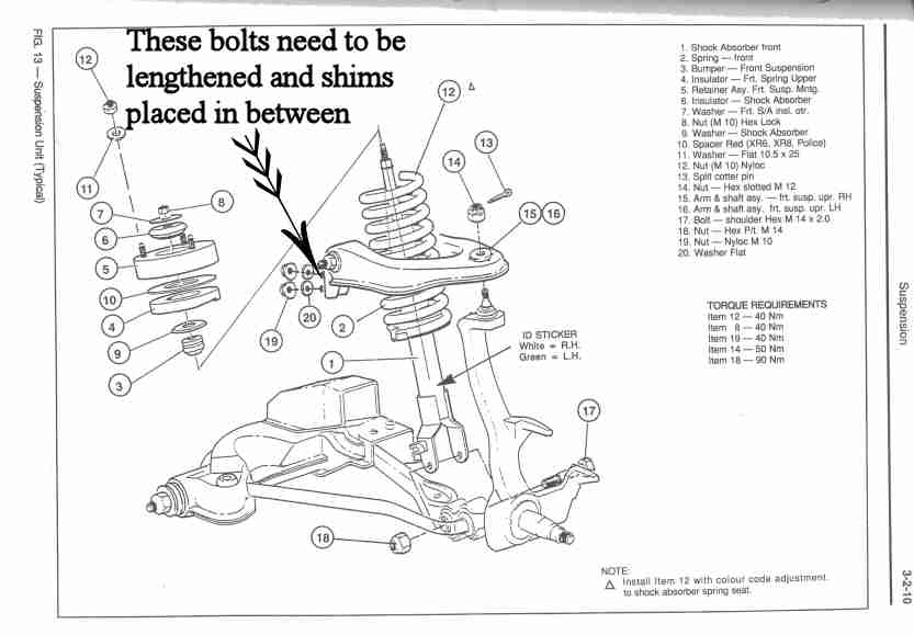 so its a longer bolt with some spacers basically. my story is i had my wheels aligned by about 2 or 3 different places and it was still chewing my tyres finally they got the aligment machine to chew out some stats sheet on the wheels angles etc Apparently i required a chamber kit. I got pedders to fit the shims type chamber kit with balance and wheel alignent for $250. good price i thought. now the problem is fixed it aint pulling to the left and in time will show if it chews as i have good tyres on the fronts. Or infact it may aswell be the lower control arm or something like that. Next time i service the car and have it on the hoist i will look out for these new shims or bolts on the arms. in the mean time any1 with a pic and wants to be creative with there paint brush feel free :) thanks for the help guys.