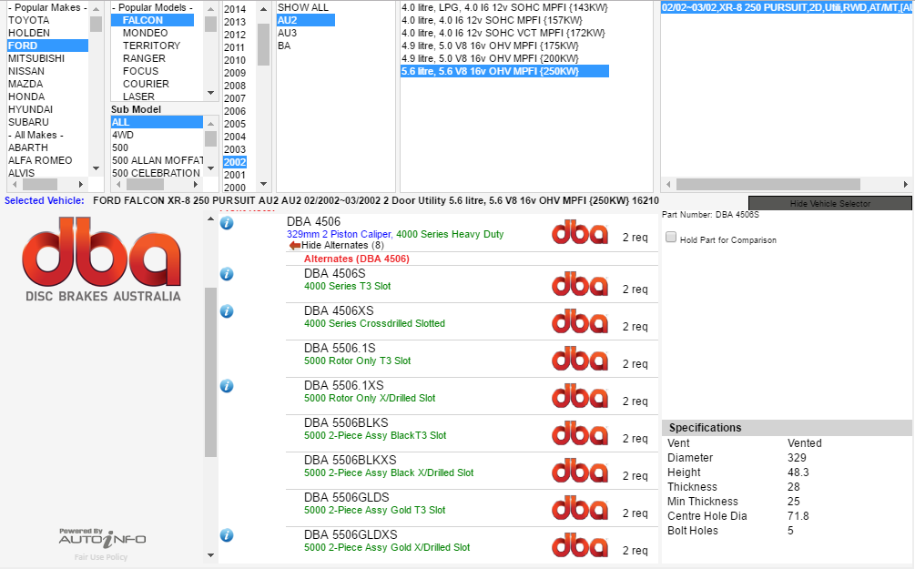 Attachment: They're about the same price as the 330mm mustang rotors, but I feel like they'll be made available by dba for many years to come, where as I'm not sure how long an Aussie company will make rotors for a 94-04 imported US mustang... These rotors are 32mm thick too so I need to check my BA/BF calipers to see if they'll take this... I found the Au 330mm rotors... Now to just decide what is going to work the best... In the 4000 series with T3 slots they're all about $470 a pair... Attachment: 1.png [ 6.44 KiB | Viewed 2620 times ] Cheers, Tim