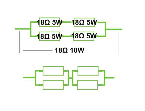 and i cant get 10w items from anywhere, nowhere in warwick stocks them, and i cant order them off the net, as i need a credit card to do it, they dont have an option for Bpay... i have to wait till i go to a bigger town to get them i guess... If you put the resistors in series and parallel then you will get the resistance and wattage you need... You can use them like in the pic to get the 10W you need, both ways of wiring will do the same thing. As long as all the resistors are the same it works with all values to double the power rating..
