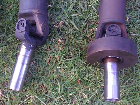 In the below piks i am comparing two auto tail shafts (one from an EB XR6 Auto and one from an EL GHIA with tickford everything auto), with an EF XR6 manual tail shaft. As you can see the manual tail shaft has this huge steel dampner on the end that goes into the gear box. What i found with the 'auto' tail shaft on the manual box is that when i would take my foot off the clutch with out accelerating is that i would have a very annoying clunk sound. when i fit the 'manual' tail shaft this noise has completely gone and can not be heard any more. Not sure if this has been discussed before although based on this its safe to say you can use the auto tail shaft but you will have a better result with the manual one. I believe this heavy steel dampener weighs the tail shaft down on the gearbox end not allowing back lash from the tail shaft.