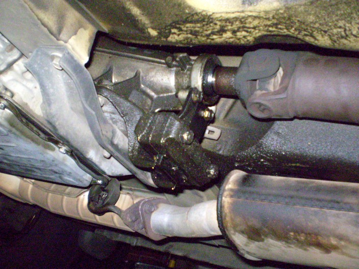 {USERNAME} wrote: {USERNAME} wrote: Have you checked the oil level and condition of the oil in the tranny???????????????? Oil and filter have been changed about a month ago by Ultratune when they did a trans service. They didn't say anything about any leaks even tho these are plainly visible under the car. I'm taking it back to them and telling them to fix it. My guess is the new oil isn't as thick as the old and it's leaking more and stuffed something else in the process. Here's a pic of the seal that's leaking. It's made a mess under the car. That mess has been there quite some time. A couple of other things to check....slip yoke bush, and the welsh plug in the slip yoke itself. I was sealing those welsh plugs under warranty over 10 yrs ago.