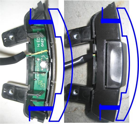 I popped open the case of a cruise switch just today and took a bunch of pics. One of the first things that came to mind, though, was how much room there is at either end of the case, and how simple it might be to add flappy-paddles with the switches INSIDE the button casings, ready to integrate directly into the single-line resistance-descriminated solution that Data_Mine is assembling.