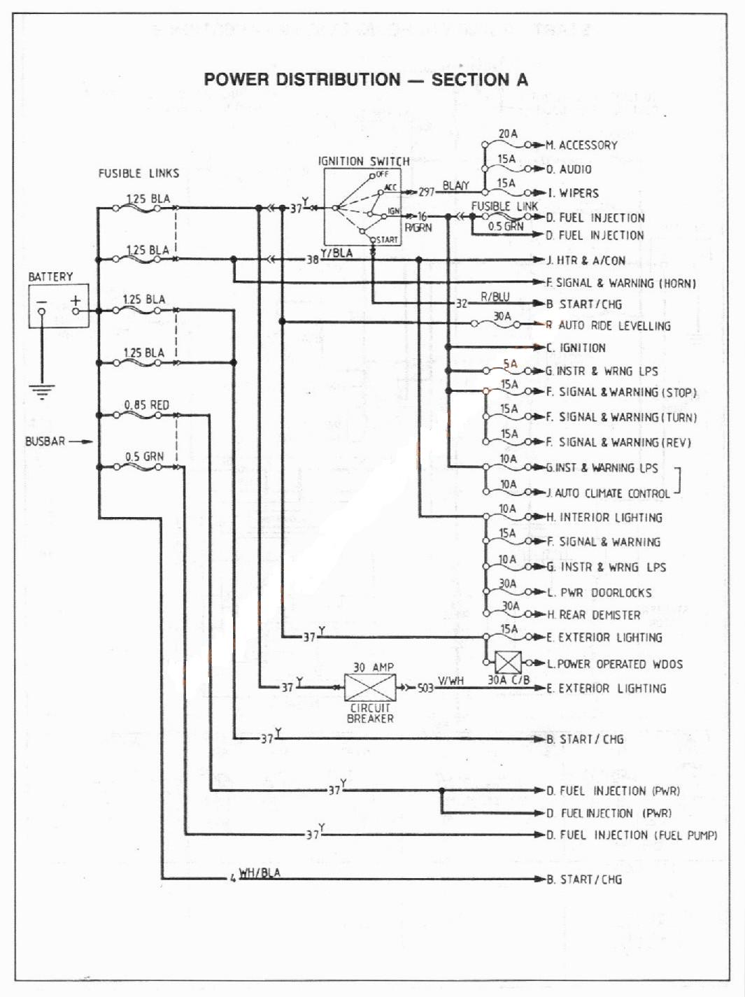 I've included an EF diagram showing the 7 fusible links (possible 6 with no abs) and the ratings. As you can see some links need to be changed. I would also take the connecting wiring with the block so you have something to solder too. Should have everything you need at the wrecker except for some heatshrink. Make sure the block and wires are free from corrosion (close to the battery). Also check to see which fusible links bolt in and which ones push in. Some of the higher rates links have a small bolt at each end for a good mechanical connection. You will have to determine which block has the best system to suit the EA. The EF/EL may have too many push in type with not enough current handling ability. Don't get me wrong, the EF one could fit easily but you may have to wire up individual circuits so they match the EF links. I could work this out for you if you go down that path.