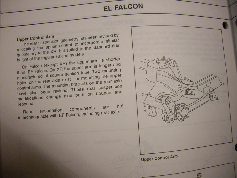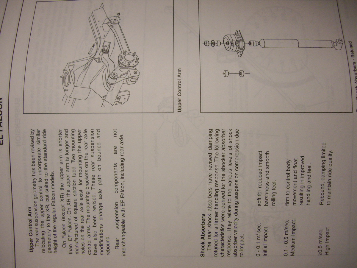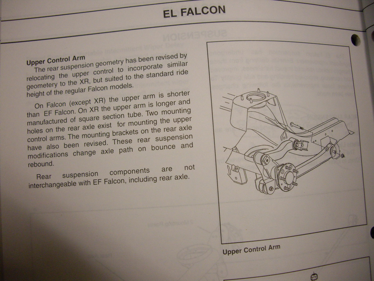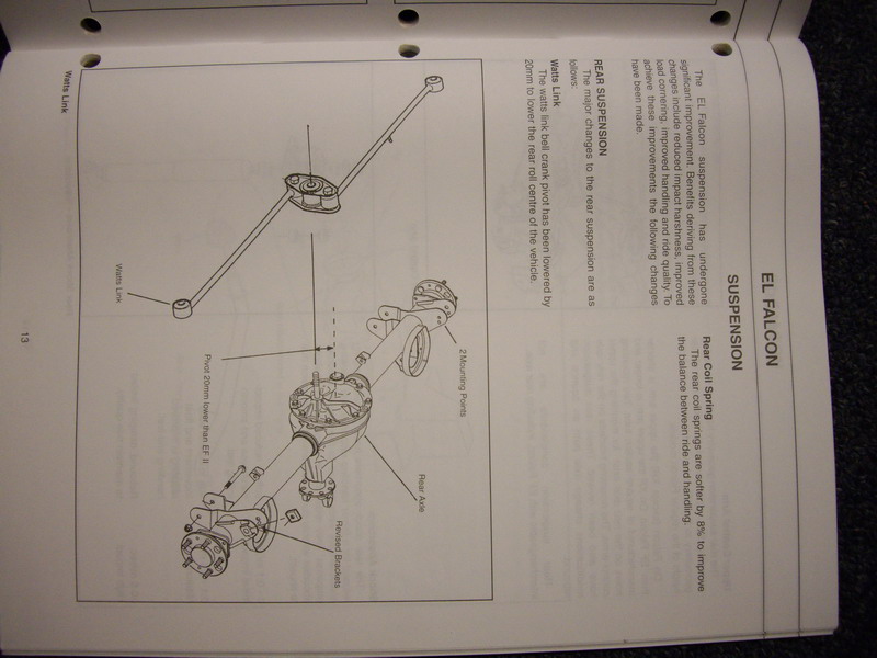 {USERNAME} wrote: Good to see they appreciate you posting this up IIRC the handbrake brackets can be P clip type over the diff housing, or a casting in the hat where the cable goes through. Is the book the 3 book EF/EL ford shop manual ??? I was a Registered Ford Technician....that is a book from that time when the EL first came out. It isn't a workshop manual, just a "new model introduction" booklet. I have them for several models, Explorer, Taurus, XH ute, Courier, AU1 falcon, EL falcon, Festiva's, etc.