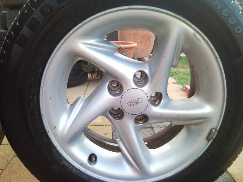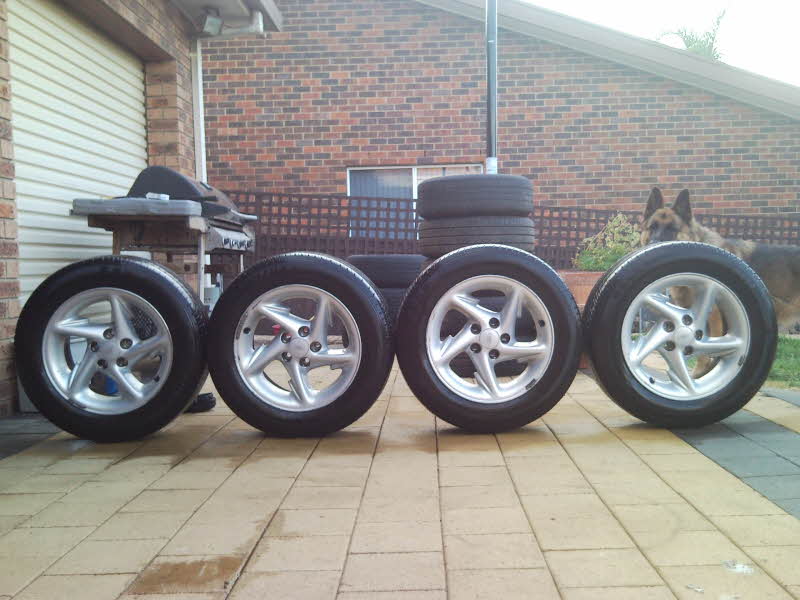 I also have the wheels at home so I was able to take better pictures to give a better idea. Didnt have any degreaser, tyre clean etc so only gave them a blast with a hose, will look better with a decent one, just dont have time to go get all the crap and actually clean them properly. The wheels are in pretty good nick, they have the usual wear from stone chips etc but they have very little gutter rash and overall have very little wear for their age. They are in a decent looking sports tyre a goodride H600. Backs have about 75-80% tread and fronts are about 50% or so, maybe a tad more. Here are pictures of all four wheels for sale. looking for $425-$450 will consider swaps Cheers