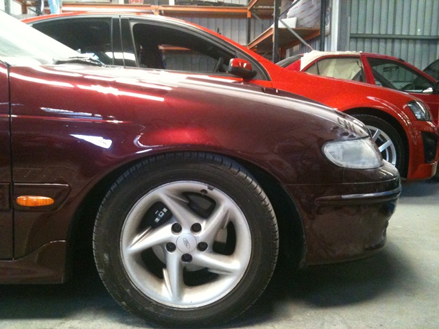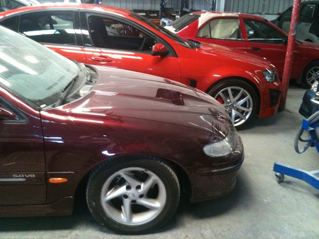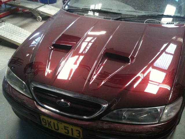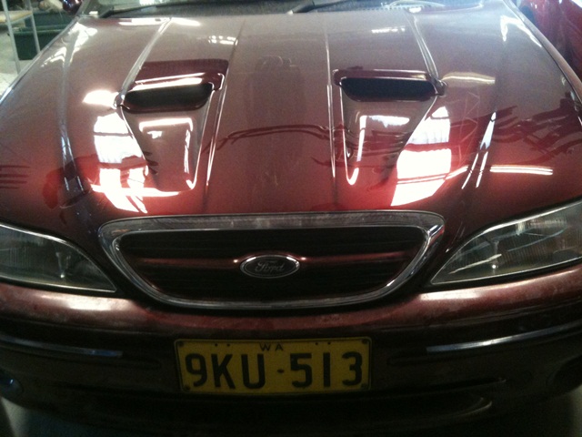 Bonnet has been blocked twice and painted. As you can see its pretty dusty in the workshop, but tommorrow she'll be all cleaned up after a bit of cut I think they said and buff etc. Question.. What would you recommend.. the XB vent inserts (the bits at the front of the nostrils) are currently the colour of the car. Do you think they should be black. If I think about Ford in the 1997, I'm inclined to believe that they would paint the inserts the same colour. I'm of two minds.. Burgs or black. On a different note, my headlights were misty yellow, well managed to remove the yellow..apparently the clear coat on them goes yellow) and re applied it and brought the old headlights back to life! Pick her up tommorrow, so will post some pics of her clean (and not in a panel shop) Woody out.