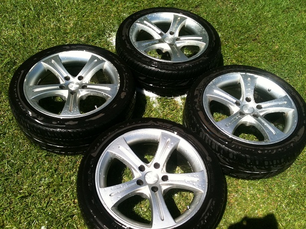 here i have 4 amg quakes with 80% tread on front and 60% tread on back, 3 rims have gutter rash one rim is fine, comes with a set of wheel nuts and lock nuts and lock nut socket,