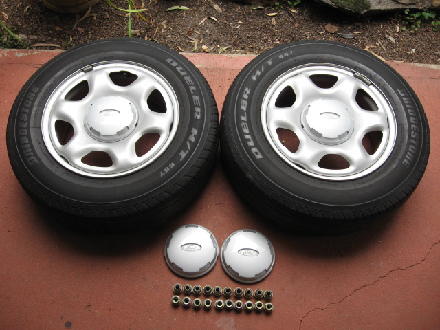 I have 2, 16inch Ford Escape wheels, plus 4 hub caps and 20 wheel nuts to suit. The tyres still have 3mm of tread and are Bridgestone Dueler H/T 687 and are 215/70R16 in size.