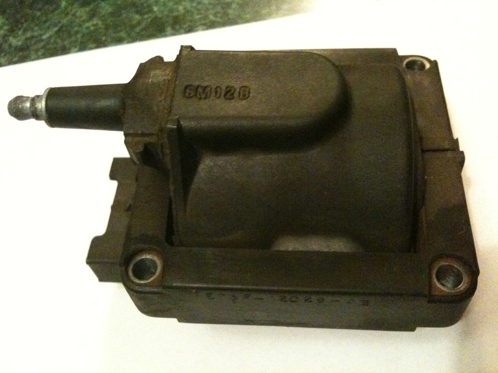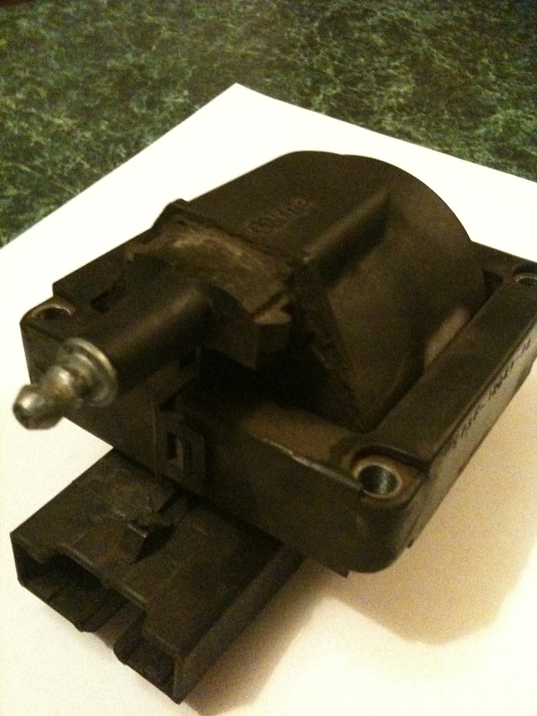 Here, I turned the engine off. I pulled the dizzy cap off and found the rotor button was quite heavily burnt and scared, and the button underneath the top of the cap was too. I've cleaned these up, but I thought possibly the ignition coil is no good... I've attached some photos to show you what the coil looks like... both sides of it have a white residue... which to me makes me think it's been arching out for a while...