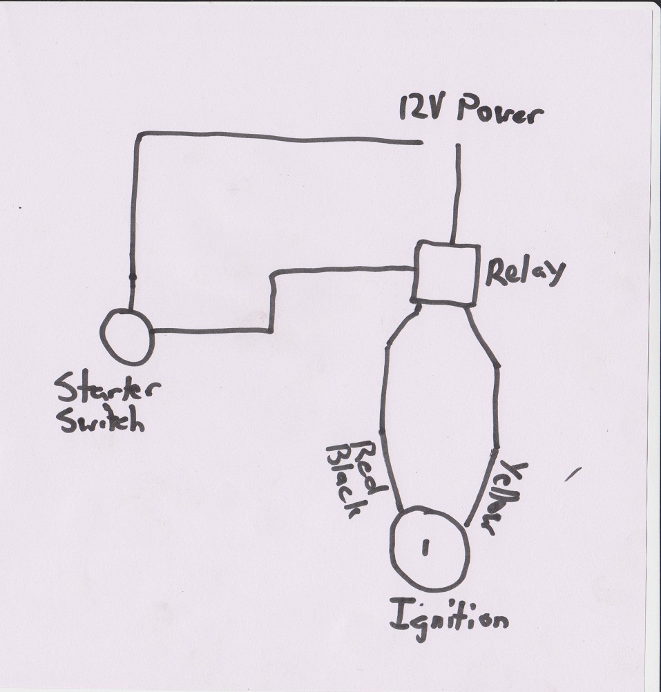 After that you need to connect 1 of the cable's from the starter switch to the relay and the other one to a 12v power source, i used the cigarette lighter. Then the last cable on the relay to the other end of the 12v power source, so if you used the + from the starter button use - from the relay.