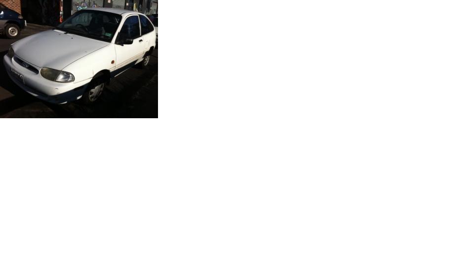 So it's a 2000 Ford Festiva 2 door hatch, 5 speed manual, Sony stereo with CD player, air-con, 126,000kms, . Serviced last month plus new brakes. Just alot of dents from people crashing into it while parked on the street :(