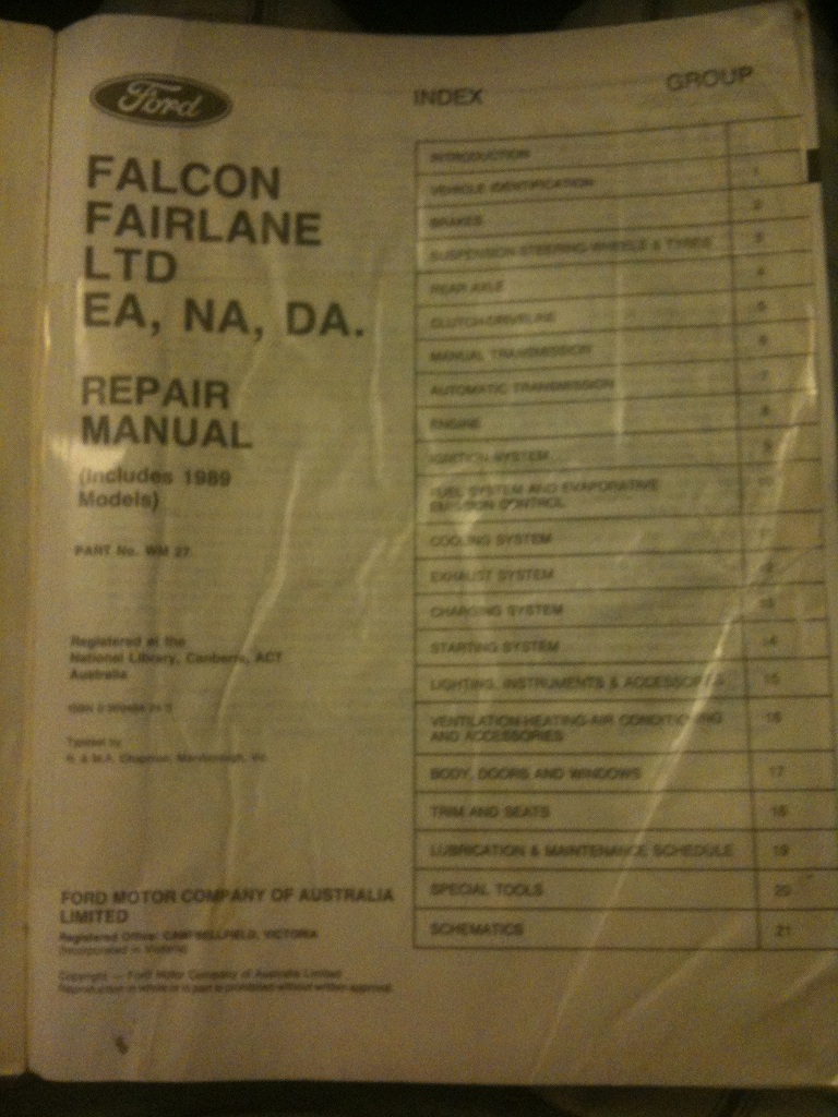 I have a Falcon-Fairlane-LTD EA-NA-DA Repair Manual (Ford Version) including 1989 models. Part No. WM27 It's in good condition on the outside though the pages within are very good condition. No requirement for it anymore. $25 plus postage