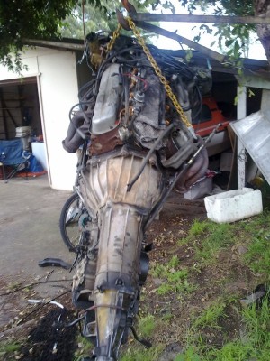 Engine is out, AC compressor is still in the engine bay.