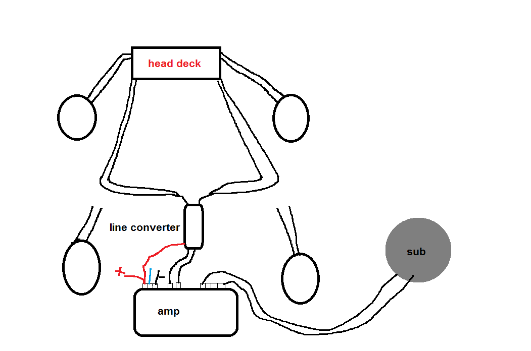ideally u would run front speaker wires to a line converter for a 4 channel amp to run ur speakers and the rear speaker wires to run your sub amp, so then that way theyre all acting as signal wires pretty much, but they can be a bieetch to tune, as u already have bass, treb, mid ect on ur factory deck sending those signals to your speaker wires, which are now you signal wires to your amp.