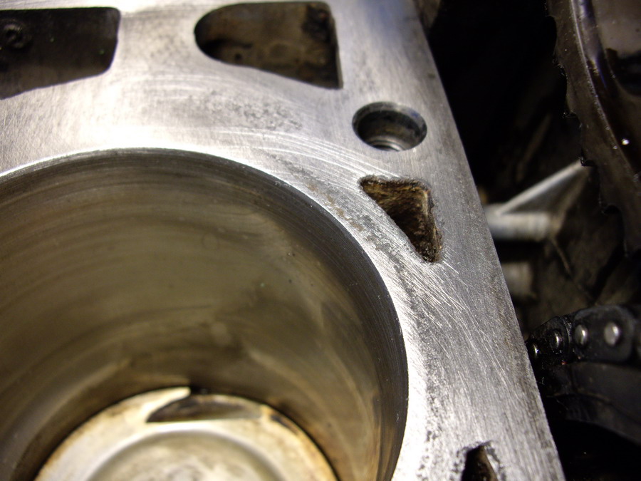 As you can see in this photo, that I had used a sanding block with wet n dry on it to try to remove as much as possible of the pitting where the fire ring sat before....this pitted surface will be no good for an MLS gasket. A composite gasket was used here, and no problems were encountered after that for some time.